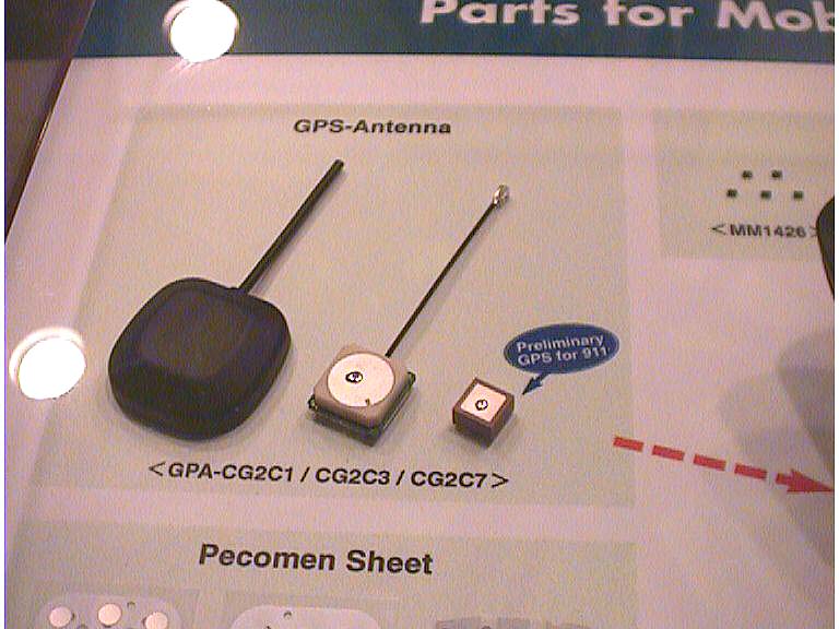 | 20周年記念の開催だったCOMDEX/Fall '99、そこで展示されていたミツミのGPS用アンテナ各種、一番左のものがカーナビ用、真中がHGR1(S)やIPS-8000、ロカティオで使われているもので、大きさは、真中の円が100円硬貨程度だ。 | |