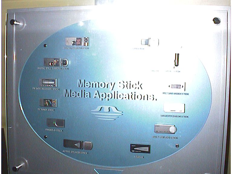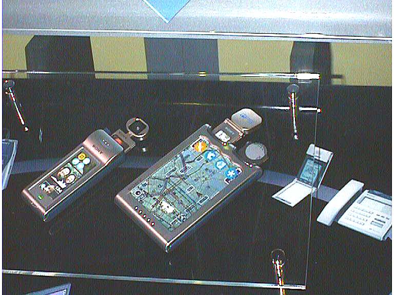 | メモリスティック型のデバイスユニットが数多く試作展示GPS、デジカメ、TV、FM、ジョグダイヤル、指紋認証等。 | こちらは、PDA型のハンディGPSにデジカメ付き、ロカティ オ対抗機種の試作品のモックだ。MobileのキーワードはGPS。 |